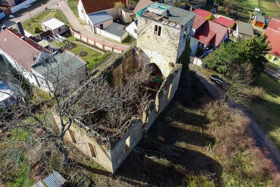 Über einhundertfünfzig Jahre später ist davon kaum etwas übrig. Bäume wachsen aus der Ruine. Das Gestrüpp steht hoch. Letzte Balkenreste verfaulen im Turm. Der Pfeifenstock der Orgel lehnt an der Wand. 1964 wurde die Kirche ein für alle Mal abgeschlossen. Der Druck der DDR-Behörden verhinderte eine Dachsanierung. Einwohner fledderten nach und nach die Reste. Mit Kirche konnte keiner mehr etwas anfangen. Agonie breitete sich wie ein grauer Schleier über das Sakralgebäude wie das ganze Land. Nach der Wende versandeten Rettungsversuche. 1994 stürzte das Kirchendach endgültig ein, der Turm verlor seine Abdeckung. Irgendwann begannen auch die Außenmauern zu zerfallen. So sieht es aus, als sich fünf Neugierige 2020 mit Astscheren und Kettensäge einen Weg ins Innere bahnen.